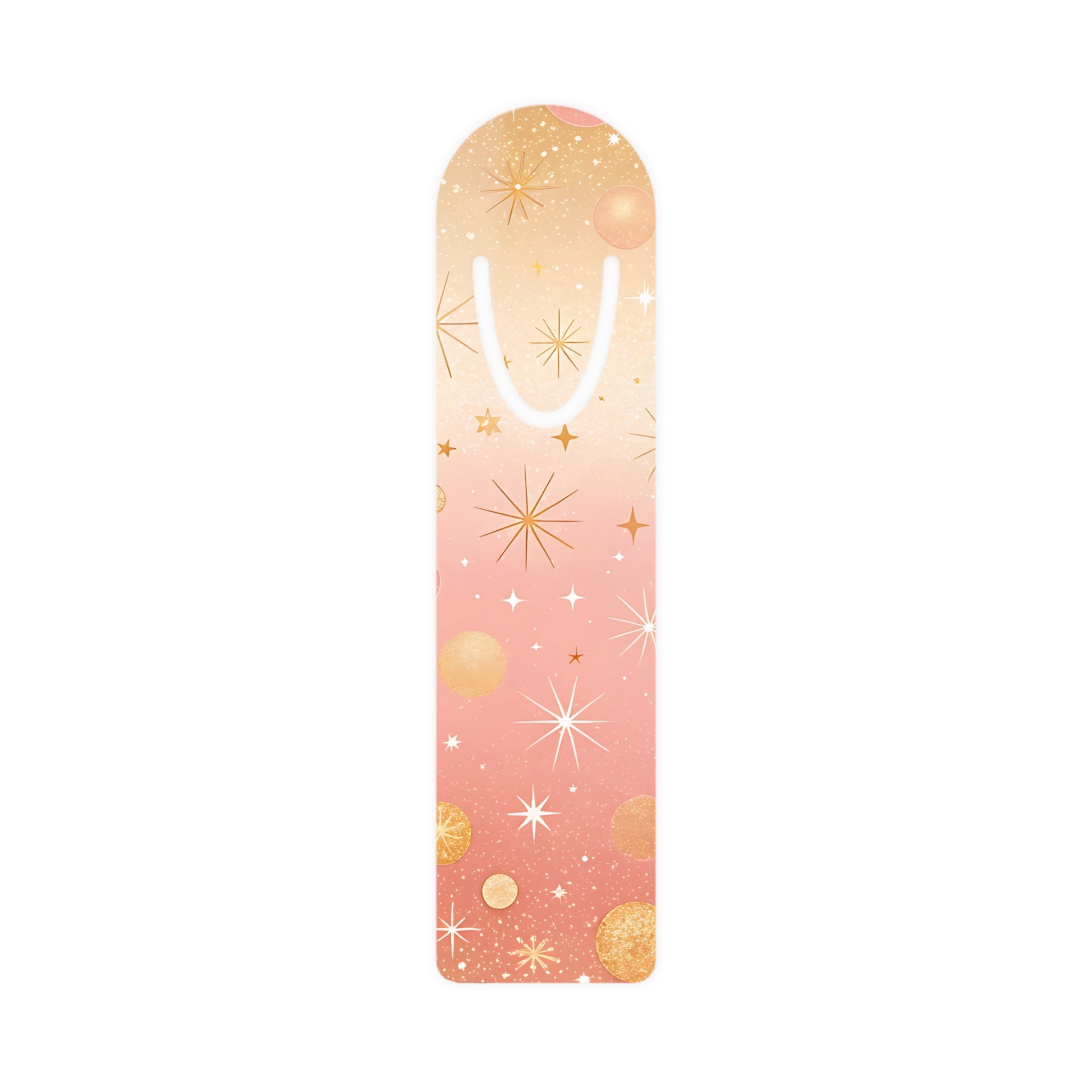 A slim, lightweight aluminum bookmark dressed in soft, celestial pastels. The front shows a delicate gradient of peach and blush with pearlescent stars, moons, and subtle gold accents that catch the light. A U-shaped slot near the rounded top slips over a page to stay put without damaging paper. The brushed aluminum back gives a modern, tactile contrast while keeping the bookmark durable and thin enough to slide easily into novels, journals, and planners.