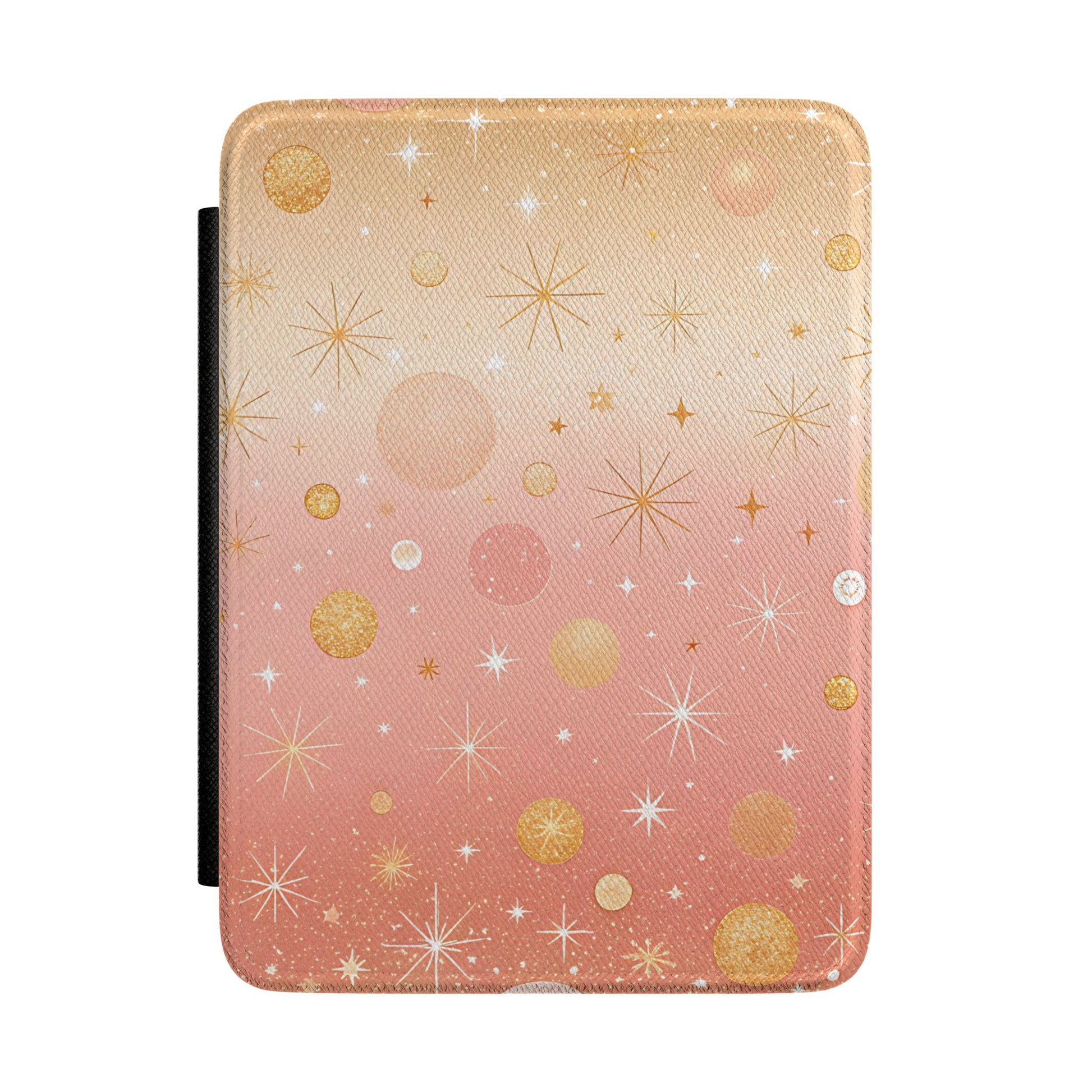 A soft, elegant Kindle case that brings a little magic to every reading session. The faux-leather cover has a satin-smooth finish with a gentle ombré of orange and champagne tones, dusted with tiny starbursts and shimmering circles. A magnetic front lid keeps your device secure while an interior hand strap and plush fabric lining make long reads comfortable and scratch-free. Slim and lightweight, it tucks into a tote or nightstand drawer and pairs especially well with evening reading rituals or travel days when you want both protection and a touch of charm.